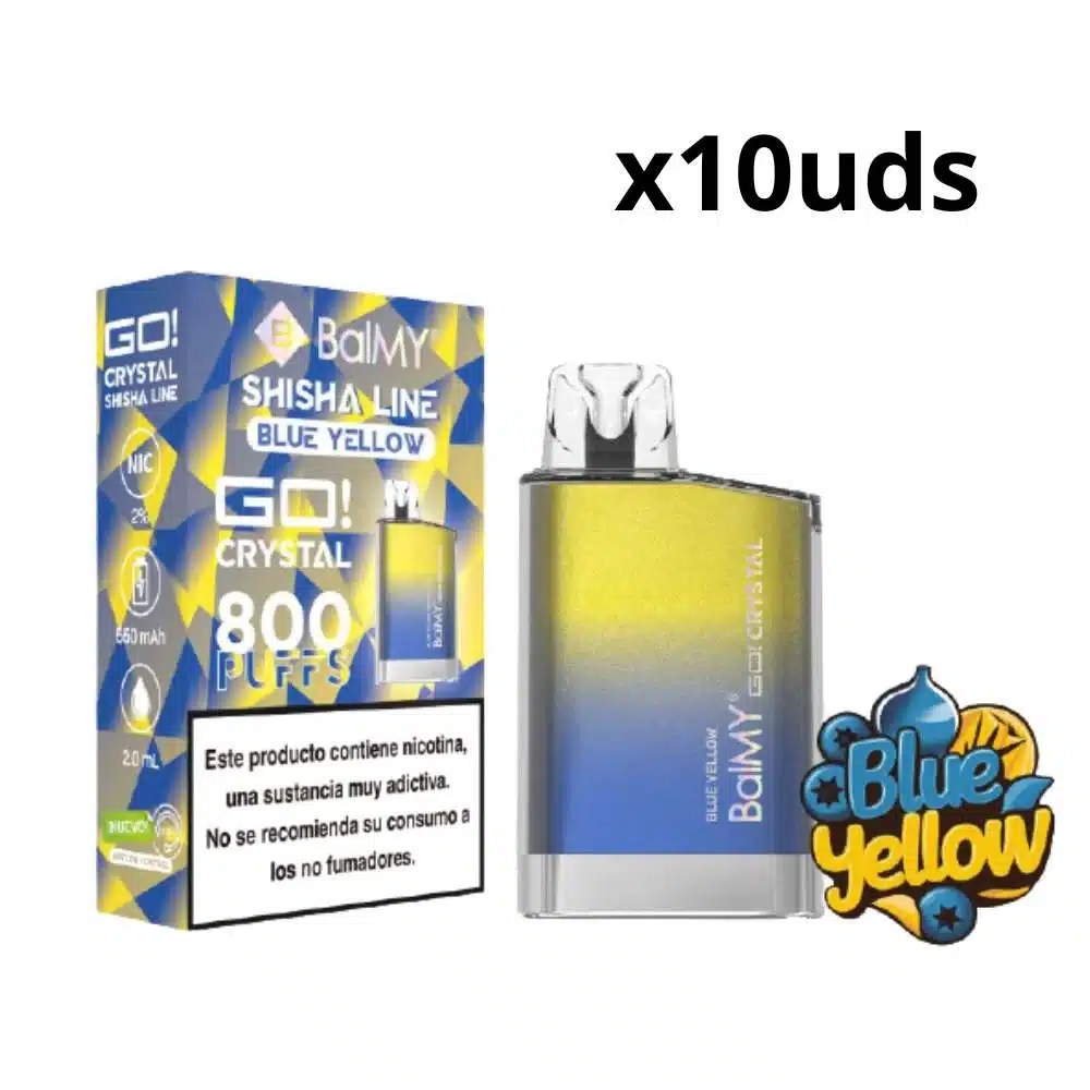 Caja BalMY GO Crystal Blue Yellow con 20 mg/ml de nicotina y sabor Blue Yellow – Melón-Arándanos. Este vaper ofrece mayor duración sin perder intensidad durante sus más de 800 puffs, comodidad gracias a un diseño ergonómico y un aspecto que refleja elegancia, vanguardismo y calidad.