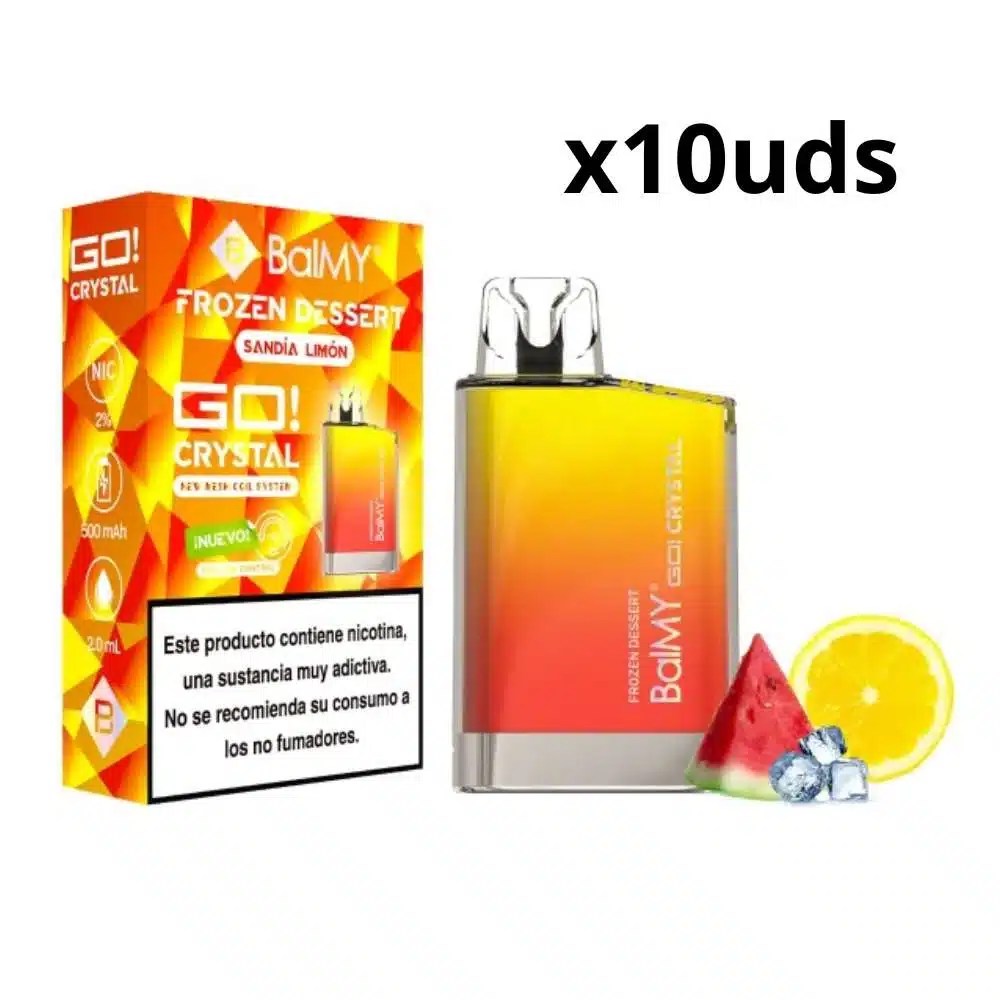 Caja BalMY GO Crystal Frozen Dessert con 20 mg/ml de nicotina y sabor sandía-limón. Este vaper ofrece mayor duración sin perder intensidad durante sus más de 800 puffs, comodidad gracias a un diseño ergonómico y un aspecto que refleja elegancia, vanguardismo y calidad.